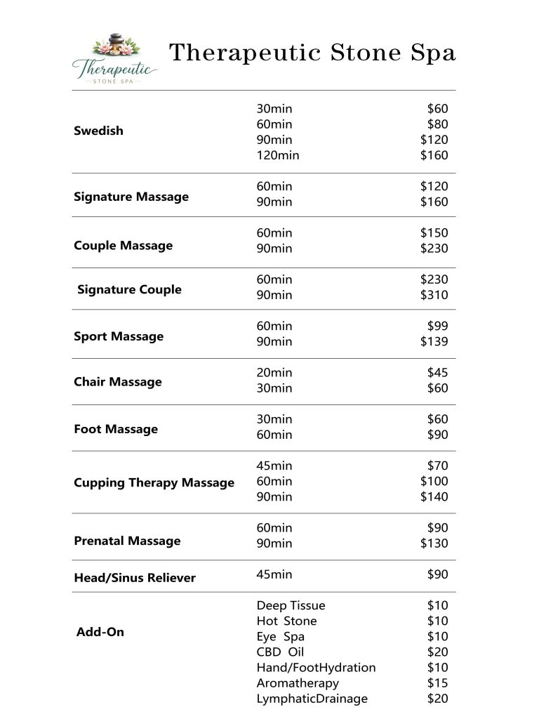 Hot stone, Swedish, and deep tissue massage tailored to your body with optional add-ons for a custom session.